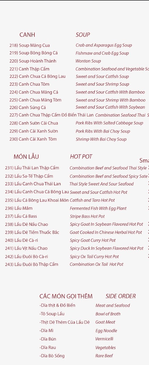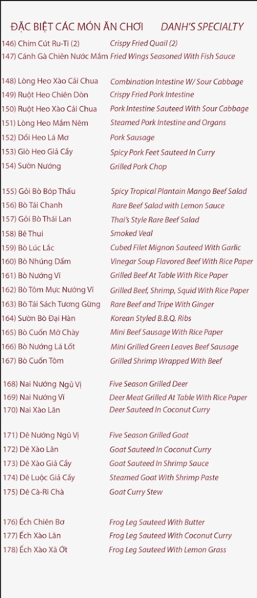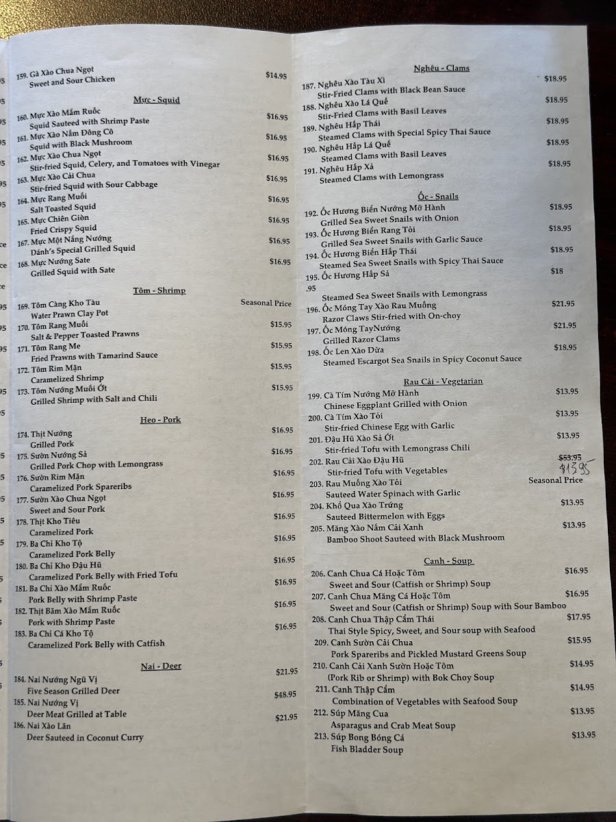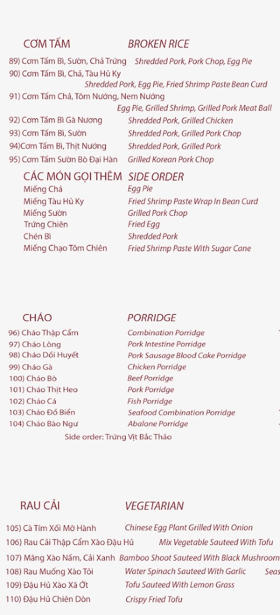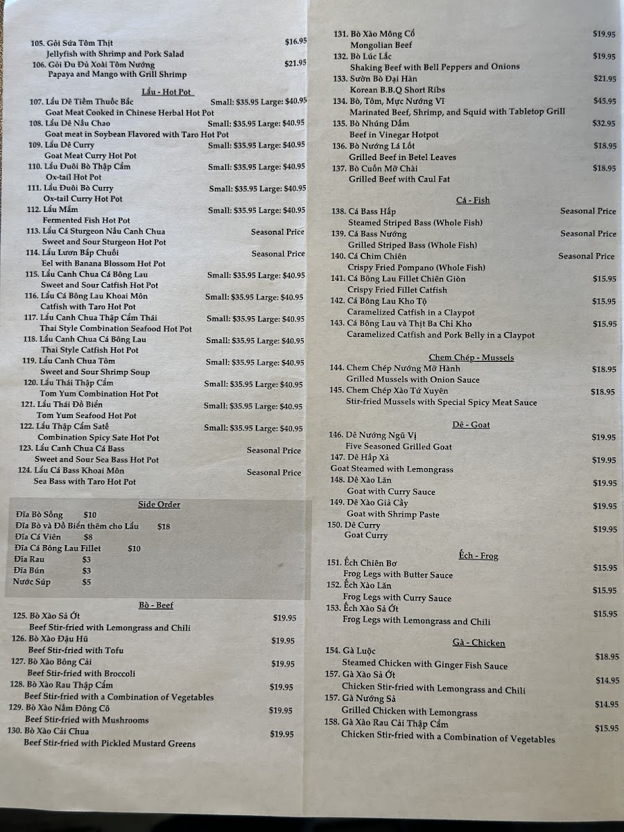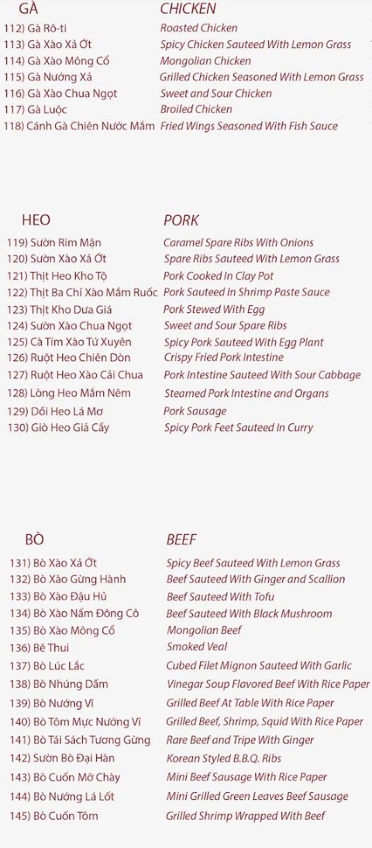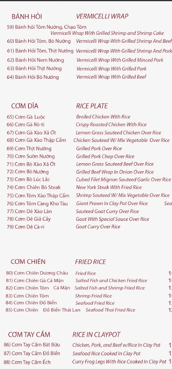 Walking through this menu feels like a small journey through Vietnamese cuisine, full of surprises and familiar comforts. Each section flows naturally, making it easy to mix, match, and discover new favorites while keeping the classics close at hand.